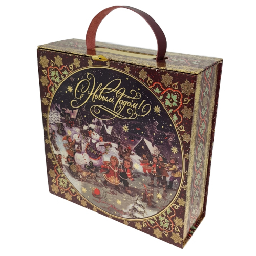 Чемоданчик на магнитах с надёжной кожаной лентой-ручкой. На нём изображены новогодние гулянья деревенских ребятишек и долгожданная встреча с Дедом Морозом. Роскошный классический дизайн, очень прочное и крепкое изделие!
