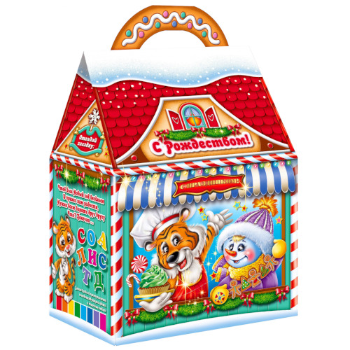 Огромное количество всевозможных сладостей (их общий вес 1200 гр.), которые не оставят Ваших детей равнодушными. Там они найдут и Несквик и Cникерс, и Красную шапочку, и Аленку, драже, батончики, десерт и еще множество других не менее популярных кондитерских изделий для Вас и Ваших ребятишек. Все это великолепие поместилось в красивую новогоднюю упаковку с очаровательным Дедом Морозом и Символом года-Тигром!